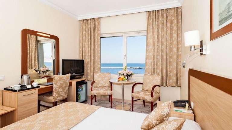 Die klimatisierten Zimmer sind mit einem Schminktisch mit Spiegel, einem Sitzbereich, einem TV mit englischsprachigen Sat-Kanälen, kostenfreiem WLAN sowie einem eigenen Bad mit Badewanne ausgestattet.
