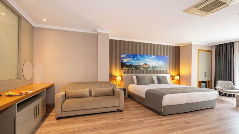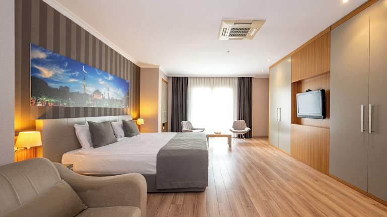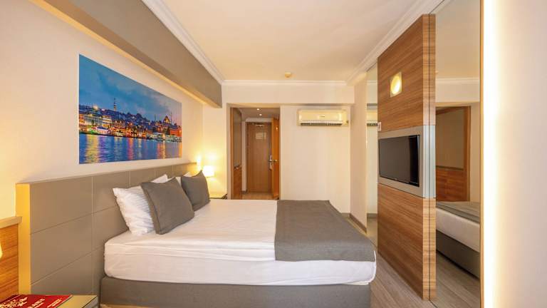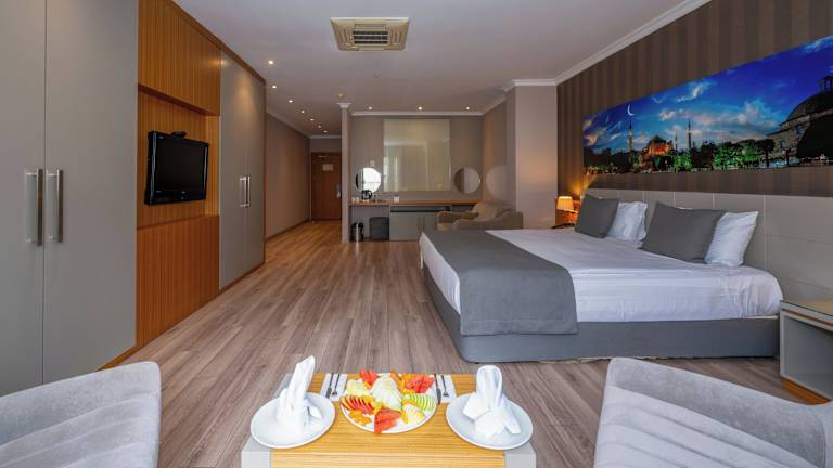 Die Zimmer im Klas Hotel sind stilvoll eingerichtet und bieten moderne Annehmlichkeiten für einen angenehmen Aufenthalt. Jedes Zimmer verfügt über einen LCD-Sat-TV, kostenfreies WLAN, eine Minibar und Tee- und Kaffeezubehör. Die Zimmer sind in hellen Farbtönen gehalten und bieten ein modernes eigenes Bad mit einer ebenerdigen Dusche.