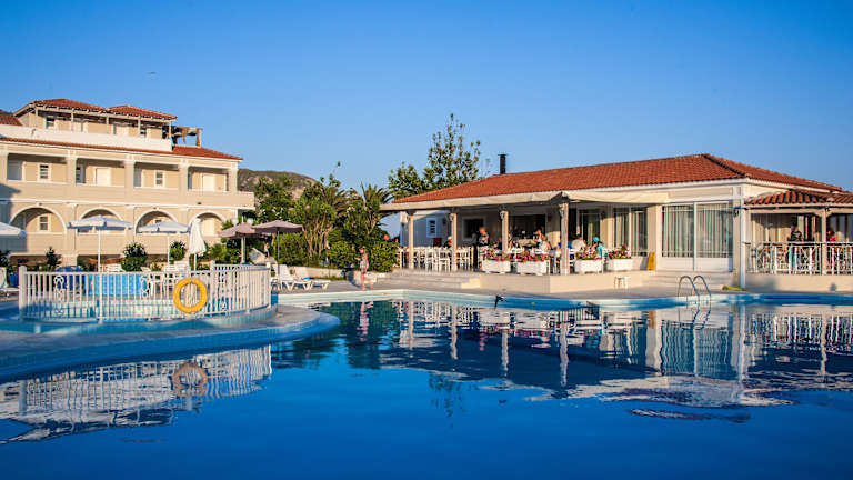 Das Klelia Beach Hotel by Zante Plaza ist ein 4-Sterne-Hotel, das Ihnen einen unvergesslichen Urlaub in Kalamaki bietet. Das Hotel liegt nur 90 m vom wunderschönen Kalamaki Strand entfernt und bietet All-inclusive-Unterkünfte. Die Zimmer und Suiten sind geschmackvoll eingerichtet und verfügen über eine Kombination aus modernem und klassischem Design. Das Hotel bietet Ihnen außerdem ein Restaurant, eine Bar und einen großzügigen Poolbereich. Genießen Sie köstliche griechische und internationale Speisen vom Buffet und nehmen Sie an den wöchentlichen Veranstaltungen wie griechischen Abenden, Karaoke-Abenden und Bingo-Abenden teil. Entspannen Sie sich am Pool, nehmen Sie ein Sonnenbad oder gönnen Sie sich eine Auszeit im Whirlpool. Das Klelia Beach Hotel bietet außerdem einen Fitnessraum und einen Kinderspielplatz. Das Zentrum von Kalamaki erreichen Sie bequem zu Fuß. Eine Bushaltestelle befindet sich in unmittelbarer Nähe und bietet Verbindungen in den Hauptort Zakynthos. WLAN und Parkplätze stehen Ihnen kostenfrei zur Verfügung.