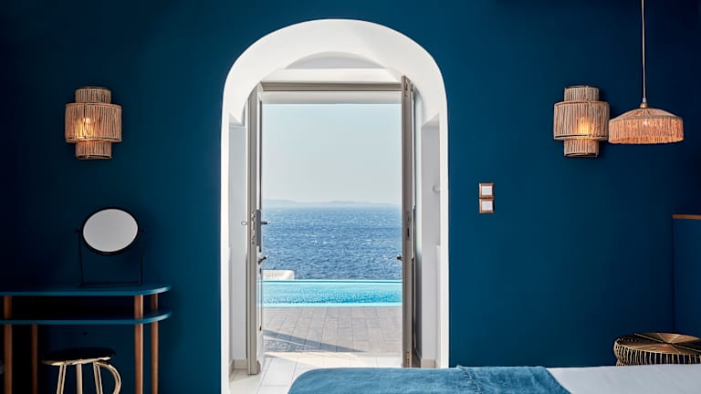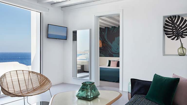 With great pleasure we invite you to meet 5-star hotel Kouros Hotel & Suites in Mykonos. Kouros Hotel & Suites is regarded as one of the premier establishments for summer vacations in the Cyclades region due to its elegance and impeccable service. Freshly renovated during Winter 2022 by French designer Fabienne Spahn, Kouros Hotel & Suites offers its guests an ideal place for comfort, relaxation, and elegance -all combined together in the idyllic setting of Mykonos Island. All beautifully appointed rooms at the Kouros Hotel & Suites have a private balcony or terrace with unobstructed sea views to the famous Tagoo beach and Mykonos Town's windmills. The luxurious atmosphere and the unparalleled service offered in our spacious Suites, combined with the authentic, simple and pure line decorations, make our panoramic sea view rooms the ideal getaway in Mykonos. The hotel features luxurious suites and villas with unobstructed panoramic sea view, a fine dinning restaurant, Narcissus, amongst the top 5 in Mykonos, a unique Spa and a fully equipped gym.