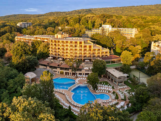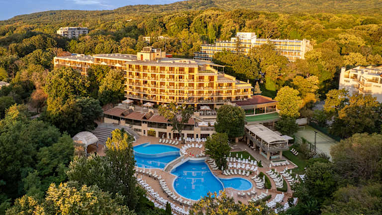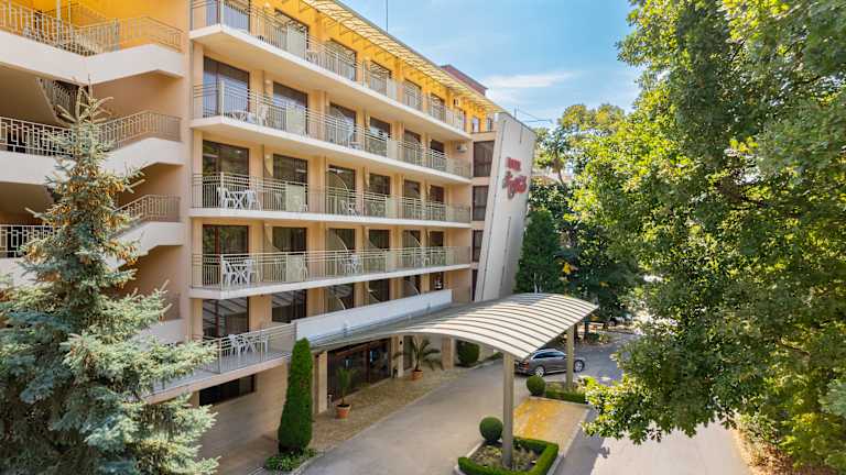 Das elegante Vier-Sterne-Hotel KRISTAL liegt gemütlich im grünen Teil des Kurorts Goldstrand.