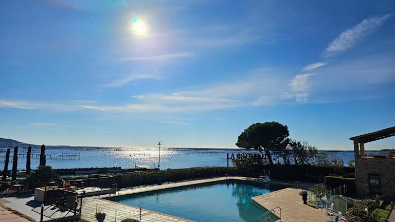 Das Hotel La Côte Bleue befindet sich in Bouzigues, einer charmanten Stadt in der Region Languedoc-Roussillon. Von der Terrasse aus können Sie einen atemberaubenden Panoramablick genießen. Die Umgebung bietet zahlreiche Möglichkeiten zur Erkundung, darunter der Hafen von Bouzigues und die nahe gelegenen Städte Frontignan und Sète. Der Bahnhof Sète ist nur 15 km entfernt und der Flughafen Montpellier ist mit dem Auto in etwa 30 Minuten zu erreichen.