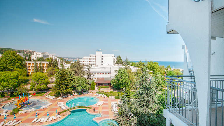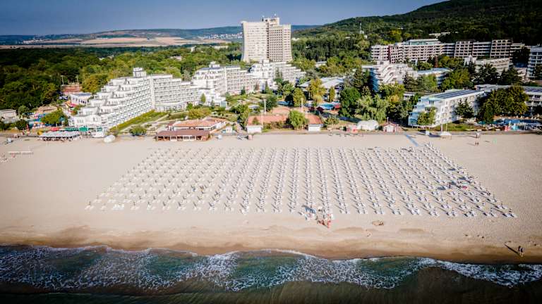 Das 4‑Sterne‑Hotel Laguna Garden befindet sich im Zentrum des Ferienortes Albena, nur ca. 150 m vom langen, feinsandigen Strand entfernt. Es liegt am Anfang der autofreien Promenade mit zahlreichen Geschäften, Restaurants und Freizeitmöglichkeiten – ideal für Urlauber, die zentral wohnen möchten. Die Hotelanlage bietet einen Außenpool mit mineralhaltigem Wasser, ein Kinderbecken mit Rutche und großzügige Liegebereiche. Ein reservierter Strandabschnitt ab der 3. Reihe mit Sonnenschirm und 2 Liegen pro Zimmer ist im Preis inbegriffen. Das Green All Inclusive-Paket umfasst alle Mahlzeiten in Buffetform, Snacks sowie lokale Getränke von 10:00 bis 23:00 Uhr. Es gibt Themenabende, Show-Cooking und bei Aufenthalten über 7 Nächte ein Dine-Around-Programm (außerhalb der Hochsaison). Das Hotel ist Teil des „Sports Around®“-Programms – Gäste können viele Sportarten kostenlos ausüben: Beachvolleyball, Tischtennis, Wassergymnastik, Darts, Badminton, Aerobic und mehr. Gegen Gebühr: Tennisplätze, Reiten, Wassersport, Fitness, Minigolf, Schwimm- und Surfschule. Insgesamt stehen im Resort über 100 Sporteinrichtungen zur Verfügung. Laguna Garden ist ideal für Familien, Paare und aktive Urlauber, die Albena in zentraler Lage mit Nähe zum Meer, Unterhaltung und Sport genießen möchten.