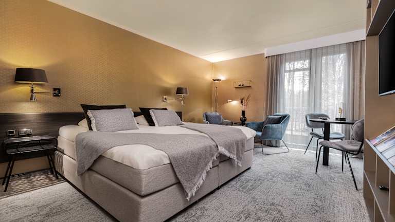 Das Landgoed De Wilmersberg ist ein charmantes 4-Sterne-Hotel, das in einer idyllischen grünen Umgebung in Twente liegt. Hier erwartet Sie eine romantische Atmosphäre, ein Wellnesscenter, ein Tennisplatz und ein Innenpool. Das Hotelzimmer sind liebevoll im romantischen Stil gestaltet und verfügen über eine Nespresso-Kaffeemaschine. Genießen Sie jeden Morgen ein reichhaltiges Frühstücksbuffet im ländlichen Stil. Entspannen Sie sich in den umfangreichen Wellnesseinrichtungen, darunter Sauna, Solarium, Whirlpool und Dampfbäder. Das Hotel verfügt auch über ein Beauty-Center, in dem Sie sich mit entspannenden Behandlungen und Massagen verwöhnen lassen können. Das Restaurant des Hotels bietet regionale und saisonale Küche in eleganter und moderner Umgebung. Im Winter sorgt das offene Feuer für Gemütlichkeit und im Sommer können Sie auf der malerischen Terrasse im Freien speisen. Die Lage des De Wilmersberg ist ideal für Wander- und Radwege. Das Zentrum von Oldenzaal ist nur eine kurze Autofahrt entfernt und Hengelo erreichen Sie in weniger als 25 Minuten.