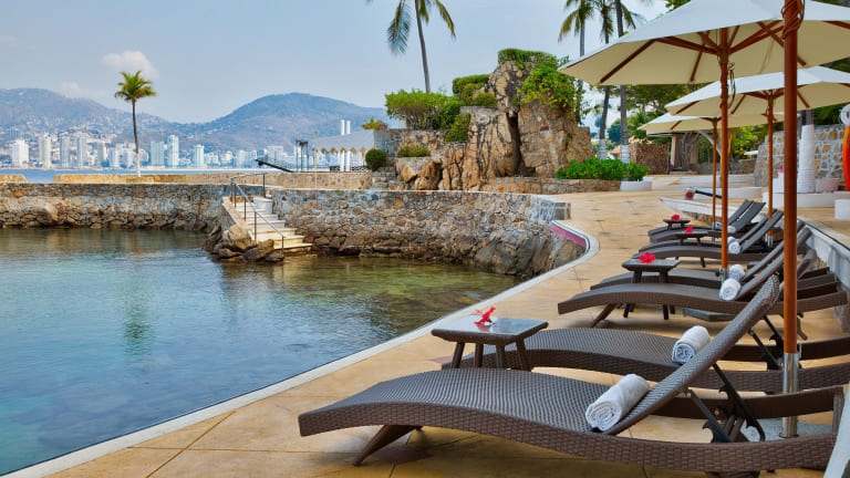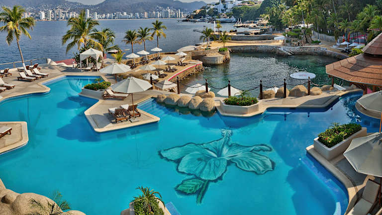 Das Las Brisas Acapulco ist ein luxuriöses Hotel, das auf einem Hügel mit Blick auf die atemberaubende Bucht von Acapulco liegt. Hier können Sie in geräumigen Bungalows mit eigenem oder Gemeinschaftspool entspannen. Genießen Sie internationale Gerichte auf der großen Terrasse des Restaurants und lassen Sie sich von einem breiten Angebot an Freizeitmöglichkeiten begeistern. Das Hotel bietet auch einen kostenlosen Shuttleservice zum privaten Strandclub, der mit Salzwasserpools und einer Sonnenterrasse ausgestattet ist. Das Las Brisas Acapulco verspricht Ihnen einen unvergesslichen Aufenthalt inmitten der üppigen Hibiskusgärten und mit erstklassigem Service.