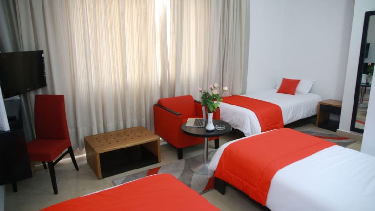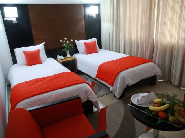 Das Hotel verfügt über 96 Doppelzimmer auf 7 Etagen, die bequem mit dem Aufzug erreichbar sind. Die Zimmer sind mit Klimaanlage, individuell regelbarer Heizung, einem Kingsize-Bett, einem Sofabett, einem Safe und einer Minibar ausgestattet. Zur Unterhaltung gibt es einen Fernseher mit Satelliten- und Kabelempfang sowie kostenfreies WLAN. Die Badezimmer verfügen über eine Dusche, eine Badewanne, ein Bidet und einen Haartrockner.