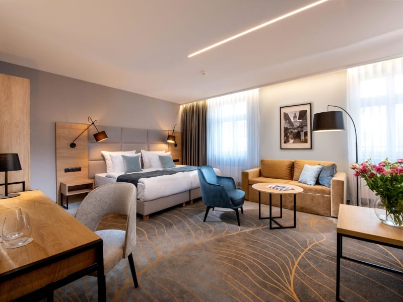 Our hotel has 28 elegantly furnished interiors awaiting for you with many configurations of sleeping and living space. Every guest will find here peace and quiet. Stylish rooms are air conditioned and equipped with black out curtains. We offer 10 Standard rooms, 4 Superior with bathtub and 14 Deluxe with resting area. Always ready for guests, uncompromisingly neat. They will make you feel comfortable after a day of sightseeing, work or business talks. Each of them can seduce with their spaciousness, functionality and atmosphere of discreet elegance.