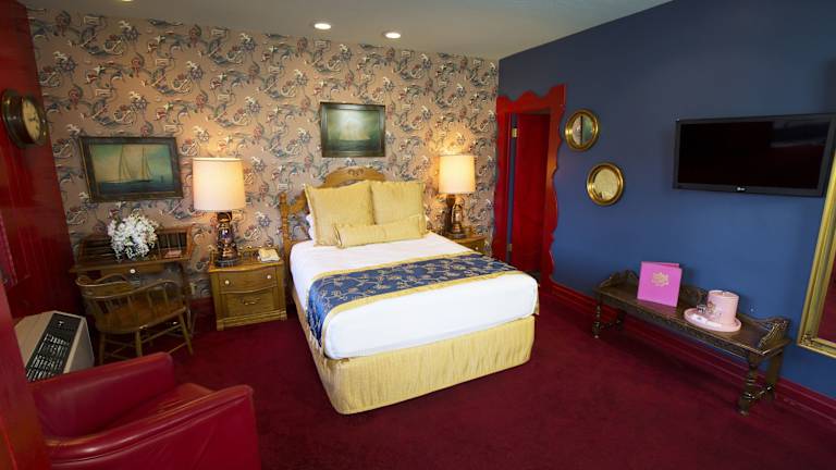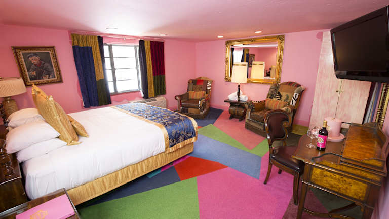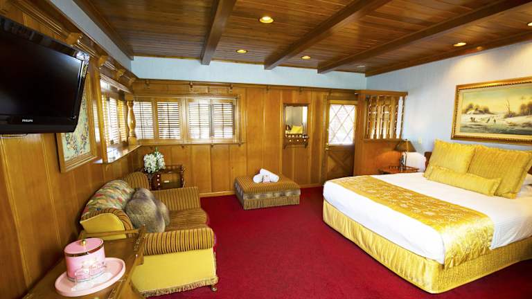Jedes der thematisch gestalteten Zimmer im Madonna Inn ist individuell dekoriert und bietet höchsten Komfort. Die maßgefertigten Möbel, die Pillow-Top-Matratze und die hochwertige Bettwäsche sorgen für einen angenehmen Schlaf. Zur Ausstattung gehören auch ein Flachbild-Sat-TV mit Pay-TV, kostenfreies WLAN, flauschige Bademäntel, kostenlose Wellness-Pflegeprodukte und eine kostenlose Flasche Wasser im eigenen Bad.