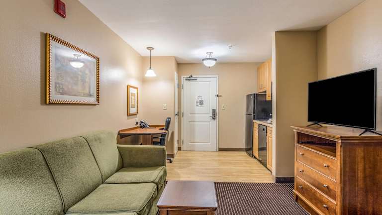 Die geräumigen Zimmer im MainStay Suites sind elegant eingerichtet und verfügen über eine voll ausgestattete Küche mit Kühlschrank, Mikrowelle, Geschirrspüler, Herd und Kaffeemaschine. Zusätzlich bieten die Zimmer Annehmlichkeiten wie eine gebogene Duschstange, einen Haartrockner, einen Schreibtisch, ein Bügeleisen und ein Bügelbrett, ein Schlafsofa, Weckdienst und kostenfreies Kabel-TV.