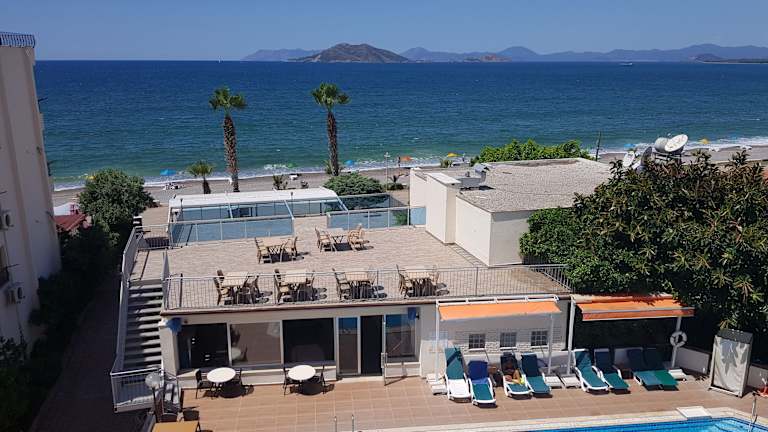Das Hotel Malhun liegt direkt am Strand, nur 20 m entfernt. Die Umgebung bietet viele Einkaufsmöglichkeiten und Restaurants, die Sie bequem zu Fuß erreichen können. Der Flughafen Dalaman ist etwa 55 km entfernt und das Stadtzentrum von Fethiye erreichen Sie nach ca. 5 km. Die Talstation des Plose Ski- und Wandergebietes befindet sich in unmittelbarer Nähe.