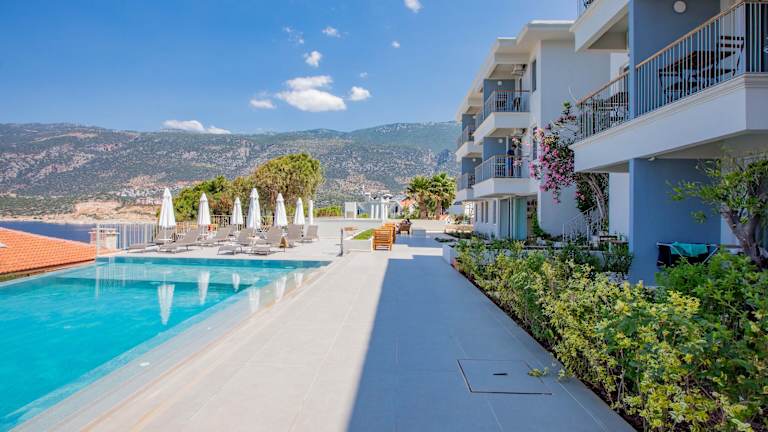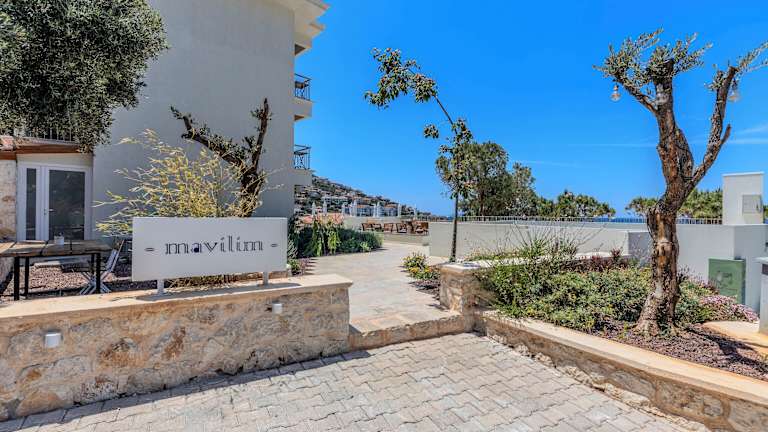 Das Hotel Mavilim bietet einen Privatstrand, an dem Sie entspannen und die Sonne genießen können. Der Außenpool des Hotels bietet ebenfalls einen herrlichen Blick auf das Meer.
