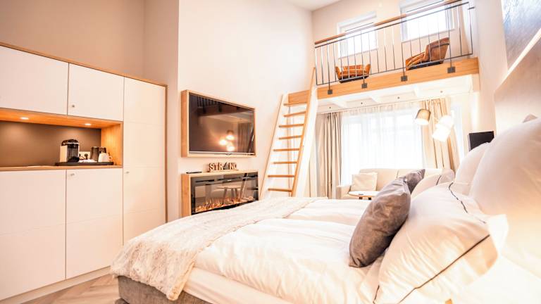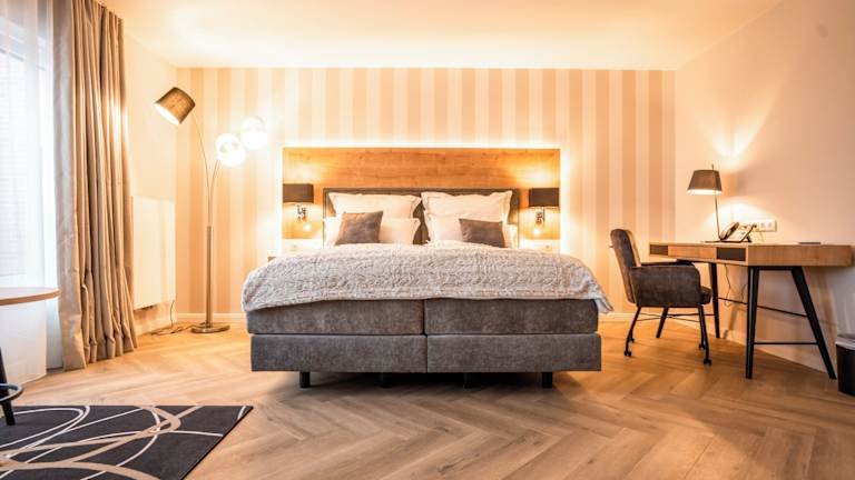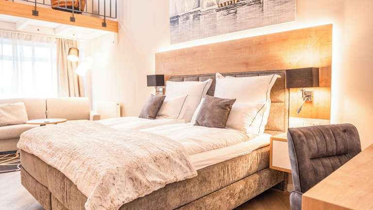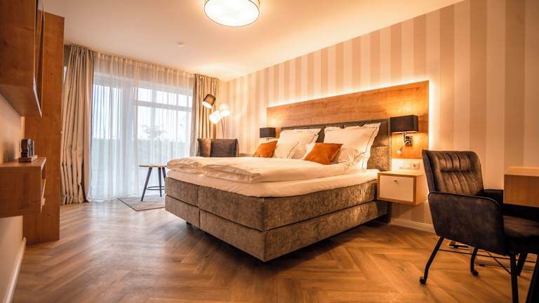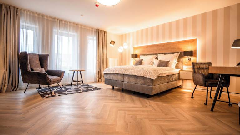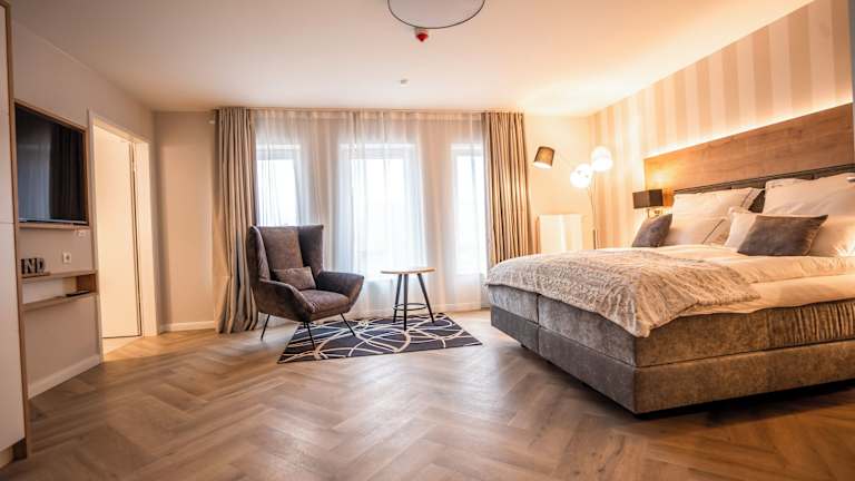 Alle unsere 62 barrierefreien Zimmer sind großzügig geschnitten und bieten viel Bewegungsfreiheit. Wände und Fußböden sind in freundlichen überwiegend hellen und beigen Farben gehalten. Durch die großen Fensterfronten wirken die Zimmer einladend und lichtdurchflutet, so dass auch die hochwertige Einrichtung perfekt zur Geltung kommt. In allen Zimmern stehen Ihnen luxuriöse Boxspringbetten in der Größe 180x200cm mit Topper, gemütliche Ohrensessel mit Beistelltischen, hochwertige Schrankkombinationen mit Kapselmaschinen und Wasserkocher für Kaffee- Teezubereitung, Schreibtische, große 55‘‘ Zoll Smart-TVs (mit internationalen Sendern), freies WLAN, Telefone, Safe, Kofferbock und Wellnesstasche mit Bademänteln zur Verfügung. Alle Zimmer sind Nichtraucher-Zimmer. Die Zimmerpreise verstehen sich inklusive Frühstück und gratis Thermen-Besuch. Alle Doppelzimmer können auch als Einzelzimmer gebucht werden. Einige Zimmer-Kategorien bieten zusätzlich Terrasse/Balkon, Galerie, Schlafsofa, Minibar, elektrischen Kamin, Wandradio im Bad und Infrarot-Paneel in der Dusche an. In den Bädern erwarten Sie großflächige Fliesen in Muschel- und Holzoptik. Die Fliesen spiegeln die schönen Naturtöne des Strandes wieder. Alle Bäder sind mit weißer Keramik, entspannenden Regenschauer-Duschen, hochwertigen Waschtischen inklusive Aufsatzbecken, Hockern, Fön, Kosmetikspiegeln, Handtuchwärmer und Fußbodenheizungen ausgestattet.