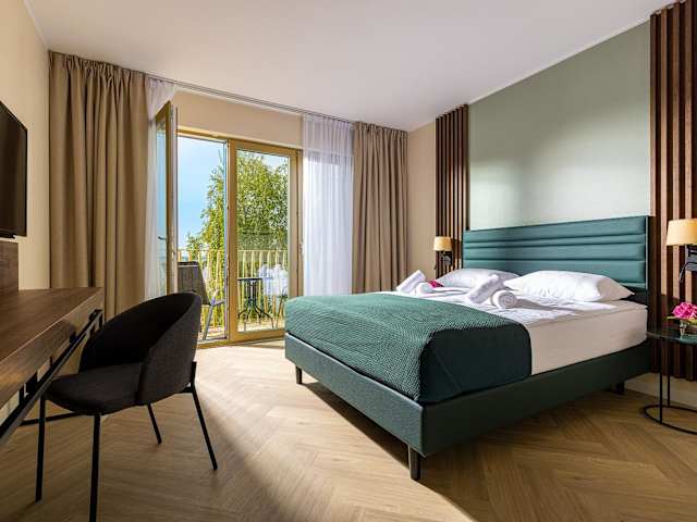 Die Zimmer im Hotel Meridian sind klimatisiert und verfügen über kostenfreies WLAN, einen LCD-Sat-TV und einen Kühlschrank. Jedes Zimmer hat ein eigenes Bad mit Dusche und Haartrockner. Die meisten Zimmer bieten einen Balkon oder eine Terrasse mit Blick auf die Putziger Wiek. Zur Ausstattung gehören auch ein Safe, ein Schreibtisch und ein Mückennetz an jedem Fenster.