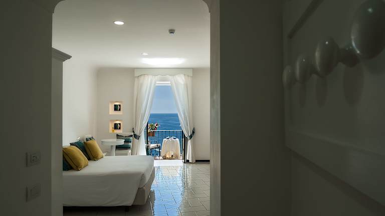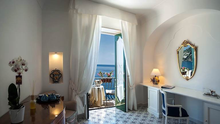 Die Zimmer sind klimatisiert und verfügen über ein eigenes Bad. Viele Zimmer bieten einen Balkon oder Aussicht auf die Bucht von Positano. Zur Ausstattung gehören ein Safe, eine Minibar, ein Direktwahltelefon, ein TV-Gerät mit Satelliten- und Kabelempfang sowie kostenfreies WLAN. Die Badezimmer sind mit Dusche und Badewanne ausgestattet und es steht ein Haartrockner zur Verfügung.