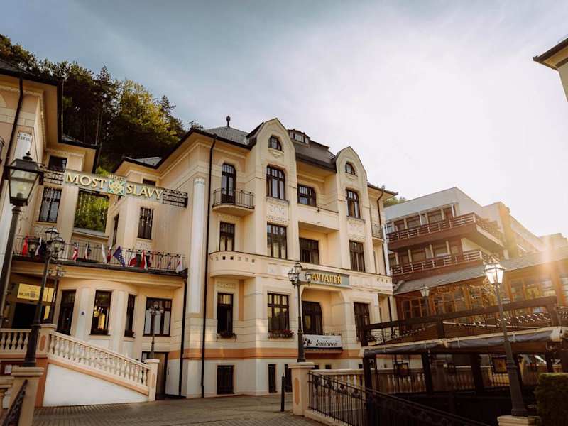 Das Hotel Most Slávy besteht aus drei Villen und bietet geräumige Zimmer und Suiten, die alle mit Sat-TV, einer Minibar und einem großzügigen Badezimmer ausgestattet sind. Einige Zimmer verfügen über einen Balkon, von dem aus Sie den Blick auf den Park genießen können. Die Zimmer sind klimatisiert und bieten Ihnen den Komfort, den Sie für einen angenehmen Aufenthalt benötigen.