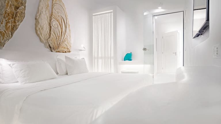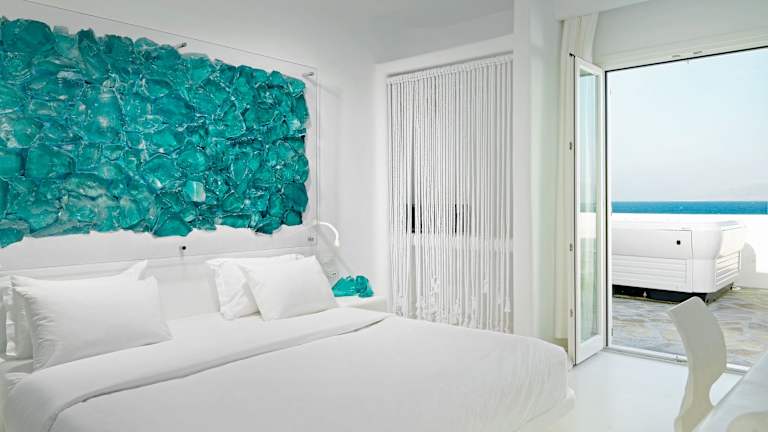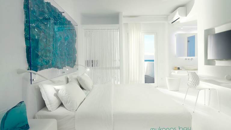 Das Hotel Mykonos Bay Resort & Villas bietet seinen Gästen einen entspannten Aufenthalt in einem Designhotel direkt am Strand Megali Ammos, nur wenige Gehminuten von der Stadt Mykonos entfernt. Genießen Sie den atemberaubenden Blick auf den Sonnenuntergang, das Meer und die berühmten Windmühlen der Insel. Die schlicht eingerichteten Zimmer sind klimatisiert und verfügen über Sat-TV, einen Haartrockner, einen Kühlschrank und einen Balkon. Einige Zimmer bieten zudem einen Meerblick. Freuen Sie sich auf ein mediterranes Frühstücksbuffet mit regionalen Spezialitäten und probieren Sie köstliche Gerichte im À-la-carte-Restaurant am Meer oder an der Poolbar. Der Poolbereich lädt zum Entspannen ein und kostenfreies WLAN steht Ihnen in den öffentlichen Bereichen zur Verfügung. Das Hotel bietet außerdem einen kostenfreien Shuttlebus zum Hafen und Flughafen.