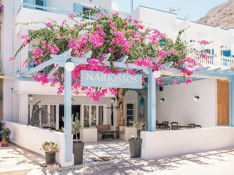 Verbringen Sie einen erholsamen Urlaub im Narkissos Hotel in Kamari auf Santorin. Das Hotel befindet sich nur wenige Schritte vom schwarzen Sandstrand entfernt und bietet komfortable Zimmer mit kostenfreiem WLAN. Genießen Sie das Frühstücksbuffet und speisen Sie im hoteleigenen Restaurant. Entspannen Sie auf der Terrasse oder in der Lounge und lassen Sie den Abend in der Hotelbar ausklingen. Die zentrale Lage des Hotels ermöglicht es Ihnen, Restaurants, Bars und Geschäfte bequem zu Fuß zu erreichen.