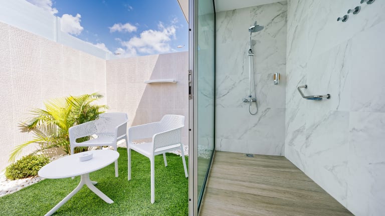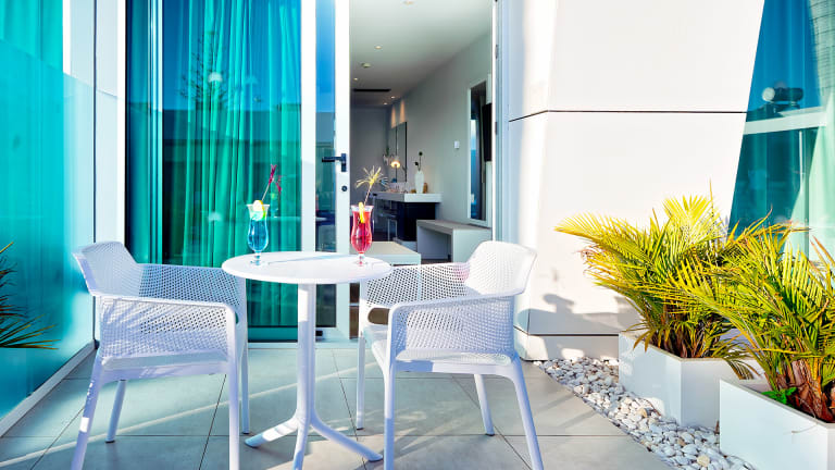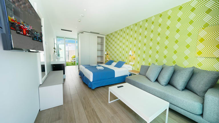 Das Zimmer ist mit einem Doppelbett ausgestattet, umwandelbar in zwei Einzelbetten, ein gemütliches Sofa, Schreibtisch, Telefon, Safe und grosser 4K UHD Flachbildschirm. Alle Zimmer haben eine möblierte Terrasse mit direktem Poolzugang.