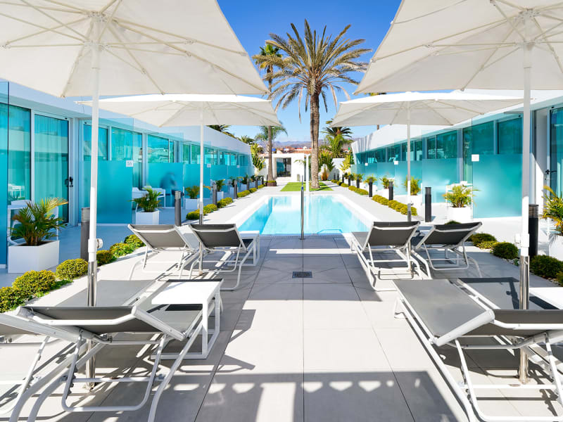 Das Hotel Nayra (nur für Erwachsene) ist ein kleines und modernes Hotel. Neu erbaut (eröffnet am 1. April 2017) befindet sich das Hotel in zentraler Lage von Playa del Inglés, vor dem bekannten Einkaufszentrum Yumbo. Eine Oase der Ruhe im Herzen von Playa del Inglés, ca. 1000 m Fussweg vom Sandstrand (15 Minuten zu Fuss) und nur wenige Meter vom Freizeitzentrum entfernt. Auf nur einer Ebene erbaut, verfügt das Hotel über 46 geräumige und helle Zimmer, die bestens schallisoliert und klimatisiert sind. Das Bad ist mit geräumiger und moderner Dusche ausgestattet sowie mit rutschfestem Boden ohne Unebenheit. Das Zimmer ist mit einem Doppelbett eingerichtet, umwandelbar in zwei Einzelbetten, und mit einem gemütlichen Sofa, auf dem Sie sich entspannen können um Ihr Lieblingsprogramm auf einem großen 4K UHD Flachbildschirm zu sehen. Alle Zimmer haben eine Terrasse mit direktem Poolzugang. Die Internetverbindung ist für den Gast kostenlos in allen Bereichen des Hotels verfügbar. Das Hotel bietet auch eine 24-Stunden Rezeption, Buffet-Restaurant zum Frühstück und Restaurant à la carte bis 19:00 Uhr geöffnet, 2 Swimmingpools, 1 Fitnessraum und 2 Poolterrassen mit bequemen Liegen.