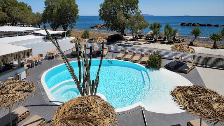 Buchen Sie das Nissia Beach Apartments & Suites in Kamari für einen unvergesslichen Urlaub am einzigartigen schwarzen Sandstrand von Santorin. Genießen Sie den atemberaubenden Ausblick auf das Ägäische Meer und erleben Sie eine entspannte Atmosphäre in diesem Boutique-Komplex. Entspannen Sie am Pool oder im Whirlpool und wählen Sie aus einer Vielzahl von Unterkunftsmöglichkeiten, die alle mit einer Küchenzeile, einem Kühlschrank und Klimaanlage ausgestattet sind.