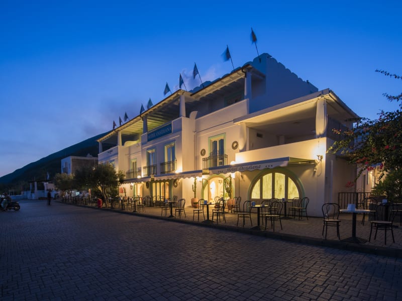 Im Süden des wunderschönen Strandes von Stromboli, inmitten der farbenfrohen Natur und den duftenden Ginsterblüten liegt das Hotel Ossidiana. Das Hotel befindet sich im Fischerquartier von Stromboli (Ortschaft Scari), nur 200 Metern von Strombolis Laubengang und wenige Schritte vom Vulkan-Museum, von Restaurants, Bars und dem Ausgangspunkt für Schiffsrundfahren und Exkursionen auf den Krater entfernt. Das Hotel mit südländischem Baustil ist vollkommen neu renoviert. Es verfügt über ein bezauberndes Panorama auf die Strände und das Meer. Seitlich des Hotels ragt der imposante Vulkan von Stromboli empor, der für seine Eruptionen, in italienisch auch „Stromboliana“ genannt, berühmt ist. Das Hotel Ossidiana ermöglicht den Besuchern, Ferien an einem einzigartigen Ort, mit direktem Kontakt zur noch unberührten Natur zu verbringen. Das Meer ist kristallklar und die Insel sehr ruhig, also ideal um sich zu entspannen und zu erholen.