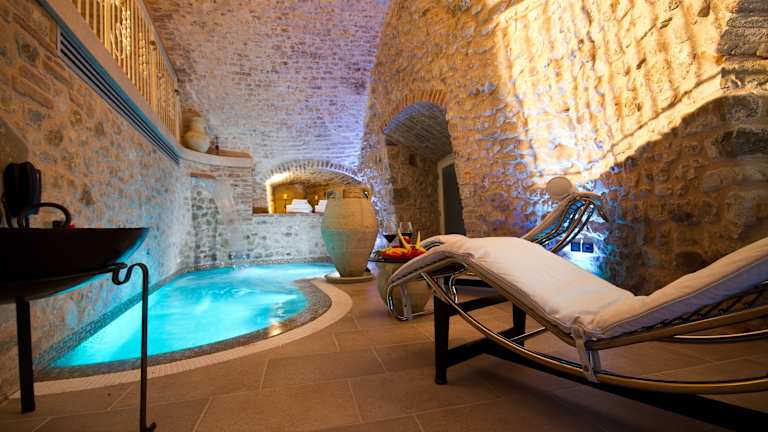 Das Hotel verfügt über 31 Doppelzimmer, 2 Junior-Suiten und 2 Suiten, die sich auf zwei 3-stöckige Gebäude verteilen. Die Zimmer sind modern und ruhig gestaltet und verfügen über Annehmlichkeiten wie einen großen LCD-Sat-TV und eine Klimaanlage. Der Wellnessbereich des Hotels ist in den Felsen gehauen und bietet eine Vielzahl von Einrichtungen wie eine Sauna, ein Türkisches Bad und einen Whirlpool. Gäste können auch aus einer großen Auswahl an Wellnessanwendungen wählen.