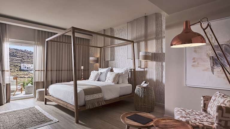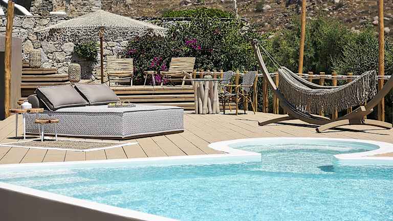 Das Hotel befindet sich in Platys Gyalos, nur 300 m vom Strand entfernt. In der Nähe liegen die Strände Psarou und Platys Gyalos sowie das bekannte Nammos. Mykonos-Stadt und der Flughafen sind in etwa 10 Fahrminuten zu erreichen.