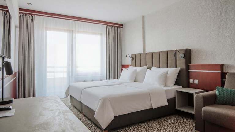 Die 55 Zimmer des Resorts sind modern und komfortabel eingerichtet und bieten alles, was Sie für einen angenehmen Aufenthalt benötigen. Jedes Zimmer verfügt über ein eigenes Bad, bequeme Betten, einen Fernseher, einen Haartrockner und Kosmetika. Für zusätzlichen Komfort stehen Ihnen ein Salzwasser-Innenpool, eine Sauna und ein Whirlpool zur Verfügung. In der Hochsaison können Sie auch den beheizten Salzwasser-Außenpool genießen.