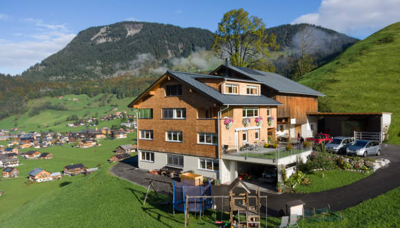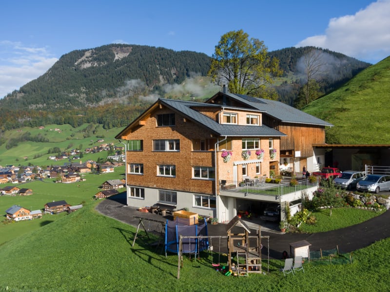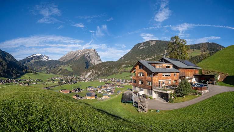 Auf einer Anhöhe zwischen Au und Schoppernau in herrlicher Lage mit wunderbaren Panoramablick auf die Bergwelt und nach Au. Sehr ruhig und sonnig gelegen.