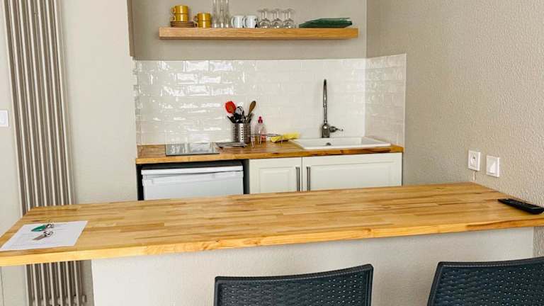 Die Ferienwohnung besteht aus einem Schlafzimmer, einem Wohnzimmer und einer voll ausgestatteten Küchenzeile mit Kühlschrank und Kaffeemaschine. Zudem steht ein Badezimmer mit Dusche und kostenlosen Pflegeprodukten zur Verfügung. Handtücher und Bettwäsche werden bereitgestellt.