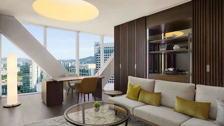Das Park Hyatt Seoul befindet sich in der beliebten Gegend Gangnam und liegt nur wenige Gehminuten vom U-Bahnhof Samseong der Linie 2 entfernt. Die Lage ermöglicht es den Gästen, bequem die Sehenswürdigkeiten und das Restaurantviertel von Gangnam zu erkunden. Das Konferenz- und Einkaufszentrum COEX ist ebenfalls in nur 5 Gehminuten erreichbar. Die Anbindung an den Flughafen Gimpo beträgt 45 km und der internationale Flughafen Incheon ist in etwa 1 Stunde und 10 Minuten mit dem Auto erreichbar.