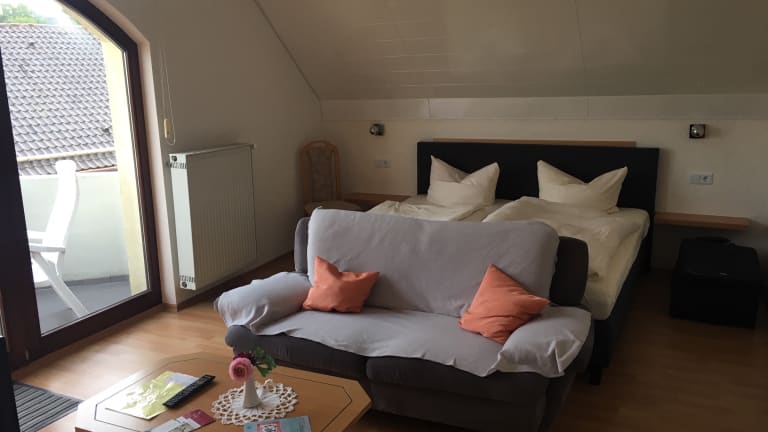 Die Zimmer in der Hotel Pension Schmitt sind in neutralen Farben gehalten und verfügen über einen Balkon oder eine Terrasse, auf der Sie die frische Luft und die schöne Umgebung genießen können. Zur Ausstattung gehören Sat-TV und ein gemütlicher Sitzbereich. Die Badezimmer sind mit einem Granitwaschbecken und einem Haartrockner ausgestattet.