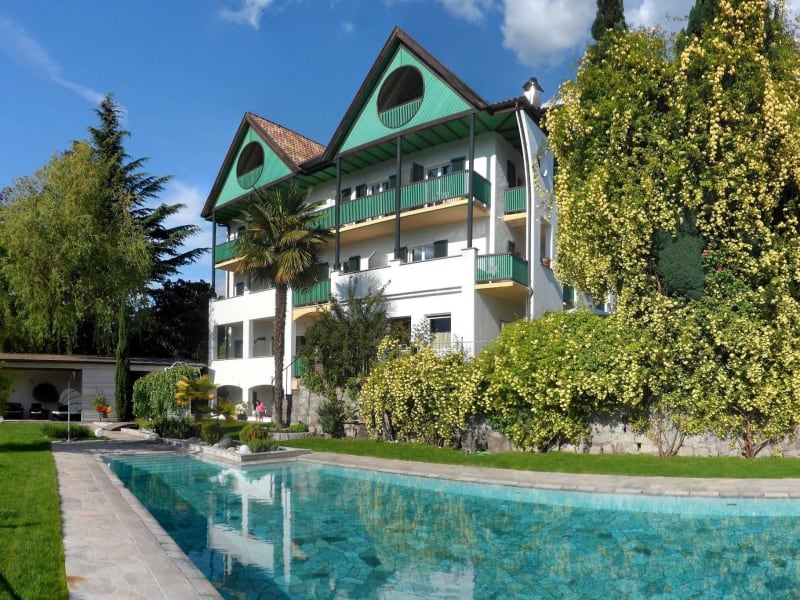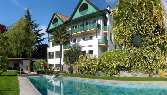 Eingebettet im Garten befindet sich unser solarbeheiztes Naturstein-Schwimmbad mit integrierter Massagebank. Vom Schwimmbad aus haben Sie einen wunderschönen Ausblick auf Meran und die Texelgruppe. Um den Hotel-Pool stehen für Sie kostenlos Liegestühle und Sonnenschirme zur Verfügung. Die Nutzung des Pools ist von April bis Oktober möglich.