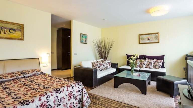 Die Perun Lodge befindet sich etwa 1 km vom Zentrum von Bansko entfernt, nur 750 m von den Skipisten. Die Entfernung zum Flughafen beträgt ca. 162,2 km. In der näheren Umgebung findet sich ein Golfplatz, der von April bis November genutzt werden kann.