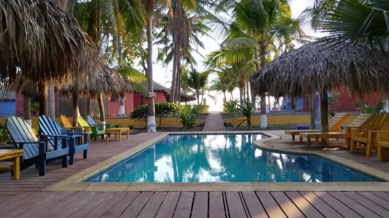 Das Hotel Pez de Oro befindet sich in Monterrico, nur 80 Meter vom Strand Playa de Monterrico entfernt. Die Anlage ist von einem Garten umgeben und bietet direkten Zugang zu einem eigenen Strandbereich.