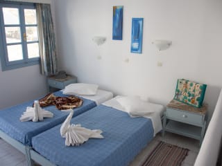 Pico Bello the hotel for your enjoyable peaceful holiday. Just 3 km from the harbor, we provide you free pick up and transfer to the hotel unit, on the beautiful beach of Grikos. Since 2003 our hotel has been updated, evolving to provide you with more and more comforts for your pleasant stay, both on our premises and on the island. Our rooms (double, triple, quadruple) are spacious with private entrances and large verandas. Wi-Fi, TV, A/C, fridge, kitchenette, baby cot and free parking and reception are available for whatever you need.