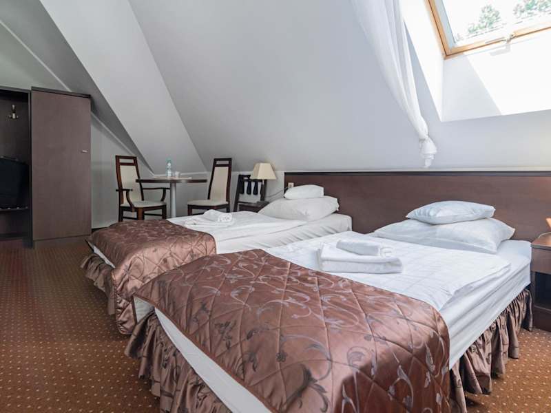 Die Zimmer im Hotel Pod Filarami sind klassisch eingerichtet und strahlen eine gemütliche Atmosphäre aus. Die dunklen und warmen Farben schaffen eine behagliche und einladende Atmosphäre. Jedes Zimmer verfügt über einen Flachbild-Sat-TV und ein eigenes Badezimmer mit Dusche oder Badewanne.