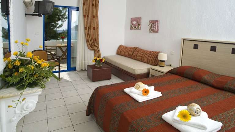 Im Hotel Porto Koufo erwarten Sie geräumige Zimmer mit klimatisierter Atmosphäre und möbliertem Balkon. Jedes Zimmer verfügt über einen TV mit Sat-Kanälen und eine Minibar, um Ihren Aufenthalt so angenehm wie möglich zu gestalten. Einige Zimmer bieten auch einen separaten Sitzbereich oder eine Küche für zusätzlichen Komfort.