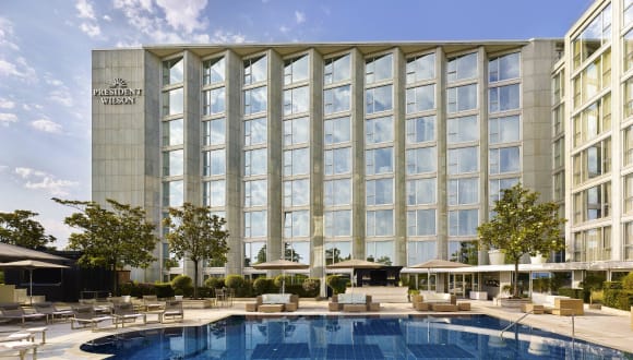 Nur einige Schritte des Lac Lémans und wenige Gehminuten der schönsten Gärten und Geschäften Genfs entfernt, eingebettet in einer unglaublichen Sicht auf den See, liegt das Hotel President Wilson, eines der zeitgenössischsten Hotels der Stadt Genf. Die luxuriös renovierten 180Zimmer und 48Suiten binden Wohlbefinden und Technologie und schenken einen unglaublichen Blick auf Genf und den See. Erleben Sie eine einmalige Erfahrung dank des ersten LaMerSPAs, einzigartig in der Schweiz. Entdecken Sie die Köstlichkeiten des sterngekrönten Chefkochs Michel Roth(MOF und Bocuse d'Or1991)im „Bayview“ Restaurant(1MichelinStern)und im neuen asiatischen Restaurant „Umami“. Tauchen Sie in der Welt der Tausenundeiner Nacht im libanesischen Restaurant „Arabesque“ ein. Im ersten Stock erwartet Sie die Poolgarden Terrasse, die den See überragt, mit ihrer Bar am Schwimmbad. Im Winter verwandelt sich die Poollandschaft in einen verzauberten Wintergarten, der das auf 28°C geheizte Schwimmbad beherbergt.