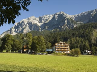 Das Hotelgelände liegt sanft am Südhang des Ramsauer Hochplateaus, nur ca. 10 Gehminuten von Ramsau-Ort entfernt.