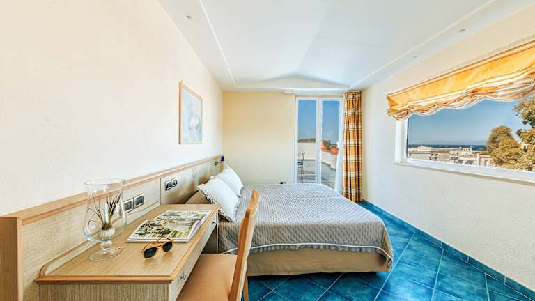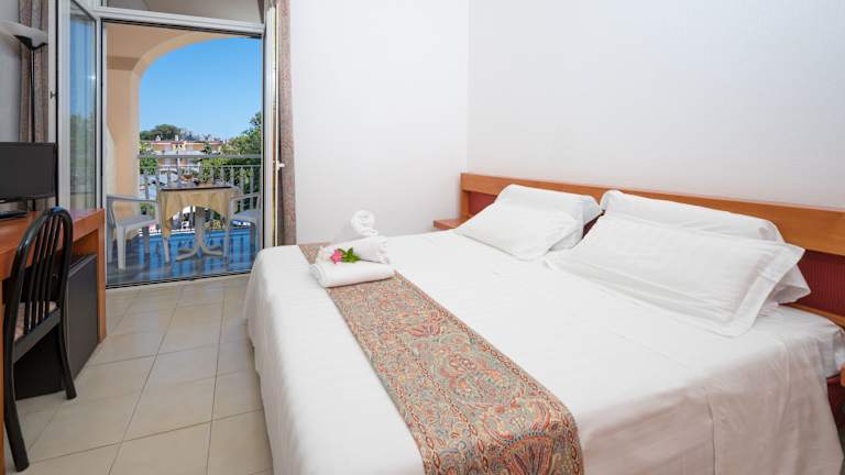 Die Zimmer sind komfortabel und verfügen über Klimaanlage, Heizung, Sat-TV, eine Minibar und Balkon oder Terrasse mit Blick auf den Garten. Es sind Einzel-, Doppel-, Dreibett- und Vierbettzimmer verfügbar. Die Toiletten sind mit Dusche, Badewanne und Bidet ausgestattet. Die Zimmer bieten zudem einen Schreibtisch, einen Kühlschrank, eine Tee-/Kaffeemaschine sowie ein Bügelset. Weitere Annehmlichkeiten umfassen einen Safe sowie kostenloses WLAN.