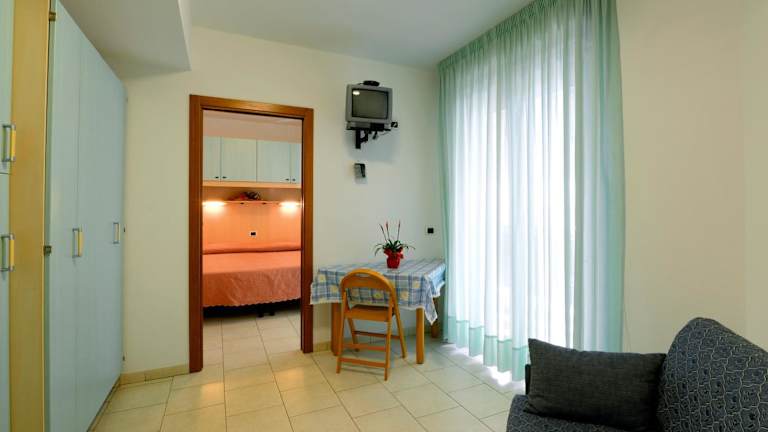 Die Apartments im Hotel Residence Margherita sind modern und funktional eingerichtet. Sie sind in hellen Blautönen gestaltet und verfügen über einen Balkon, eine Klappküchenzeile und ein voll ausgestattetes Bad. Zur Ausstattung gehören auch eine Klimaanlage und kostenfreies WLAN. Ein oder zwei TVs sorgen für Unterhaltung.