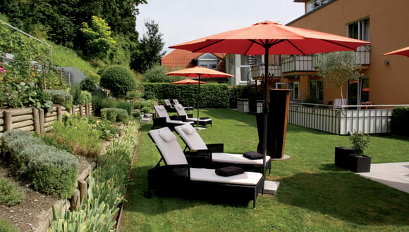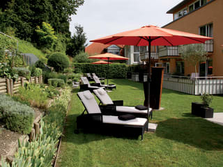 Liegewiese und Loungeecke im Hotelgarten Unterhaltungsmöglichkeiten ca. 5 min zu Fuß entfernt