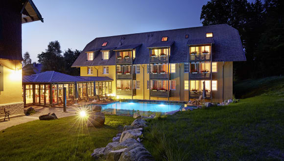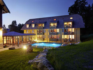 Die Ausstattung Kaminhalle, Lesezimmer mit Bibliothek, Salon für das morgendliche Frühstück und Kaffee und Kuchen am Nachmittag, Musikzimmer für Veranstaltungen und Vorträge, Gartenterrasse, Garten mit Liegewiese, kleiner Wellnessbereich 120 m² mit Sauna, Sanarium, Infrarot-Kabine, Duschwelt, Fußbecken (Kalt/Warm), Lounge mit Tee-Bar, Ruhebereich, Medical Fitness Studio, Physiotherapie-Abteilung, Fahrrad-Garage, Parkplätze am Haus und Garagen. Wöchentliches Ausflugs- und Wanderprogramm, 9 Loch Golfplatz „Himmlische Hölle“ 4 Km
