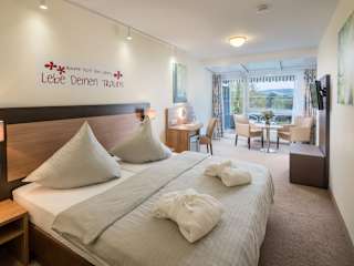Individuell eingerichtete Gästezimmer verteilen sich auf die Häuser. Alle Zimmer sind Nicht-Raucher Zimmer und verfügen über einen Balkon oder Terrasse. Die Zimmer sind außerdem mit eigenem Bad mit Dusche oder Badewanne, TV, Fön und Kosmetikspiegel ausgestattet. Leihbademantel und Saunatuch in einer praktischen Wellnesstasche ist auf Anfrage kostenfrei an der Rezeption erhältlich.