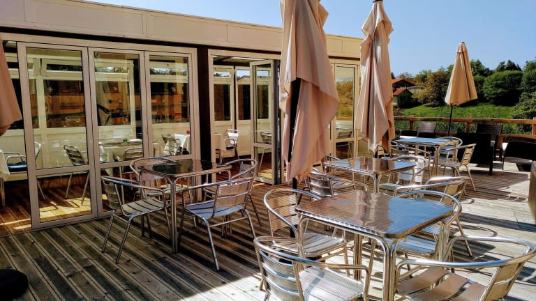 Auf der Terrasse des Hotels können Sie bei schönem Wetter entspannen und die Sonne genießen.