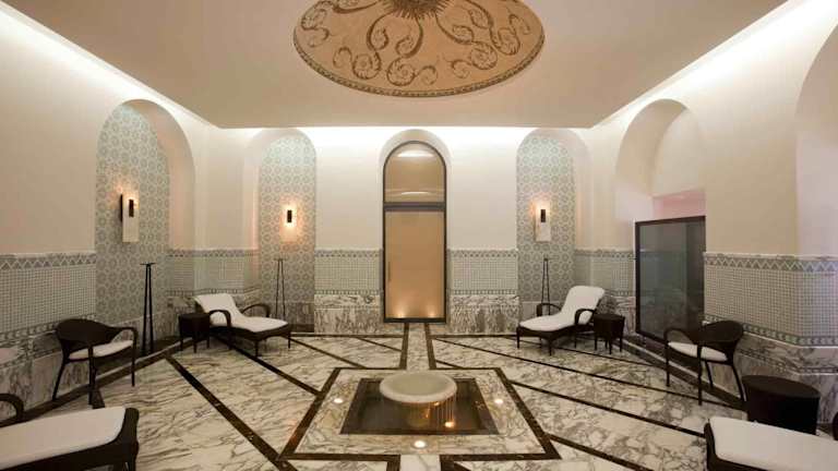 Das Royal Hotel Oran - MGallery by Sofitel ist ein luxuriöses 5-Sterne-Hotel im Herzen von Oran. Es bietet erstklassige Einrichtungen wie einen Wellnessbereich, kostenloses WLAN und einen Concierge-Service. Genießen Sie französische Küche in einem der beiden Restaurants und entspannen Sie im Dampfbad oder im Fitnessbereich. Das Hotel bietet zudem einen kostenlosen Flughafentransfer und eine günstige Lage in der Nähe von Sehenswürdigkeiten wie der Kathedrale Sacré-Coeur und dem Kulturpalast.