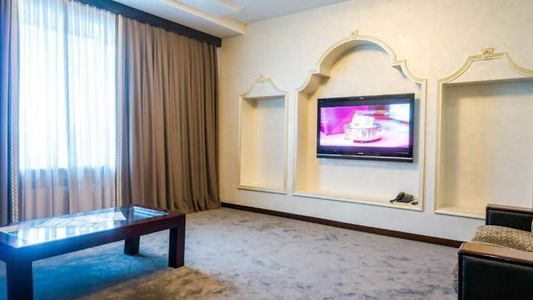 Das Royal Palace Hotel in Almaty bietet geräumige Zimmer mit kostenfreiem WLAN und ein 24-Stunden-Restaurant. Die Lage in der Nähe des Flughafens und des Stadtzentrums macht es zu einer idealen Wahl für Reisende. Genießen Sie den Komfort der klimatisierten Zimmer mit Flachbild-TVs und die elegante Atmosphäre, die durch die großen Fenster und Blumenmuster geschaffen wird. Im Restaurant des Hotels werden europäische Gerichte serviert, und kostenfreie Parkplätze stehen den Gästen zur Verfügung.
