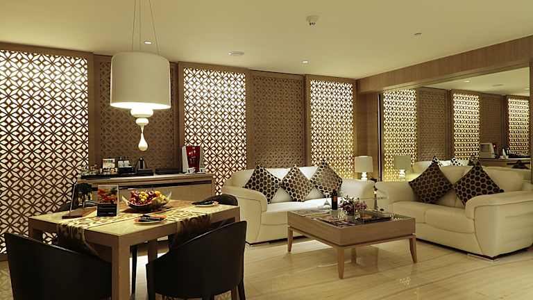 Die gastronomischen Einrichtungen des Hotels umfassen mehrere Restaurants, darunter 'The Earth Plate', das eine Vielzahl internationaler und regionaler Gerichte anbietet, und 'Namak', das indische Spezialitäten serviert. Weitere Optionen sind das vegetarische 'Manuhaar', das mediterrane Restaurant 'Mabruk' sowie 'E.A.S.T.', das asiatische Küche bietet. Zudem gibt es eine Bar und eine Lounge mit Blick auf den Lagunenbereich.