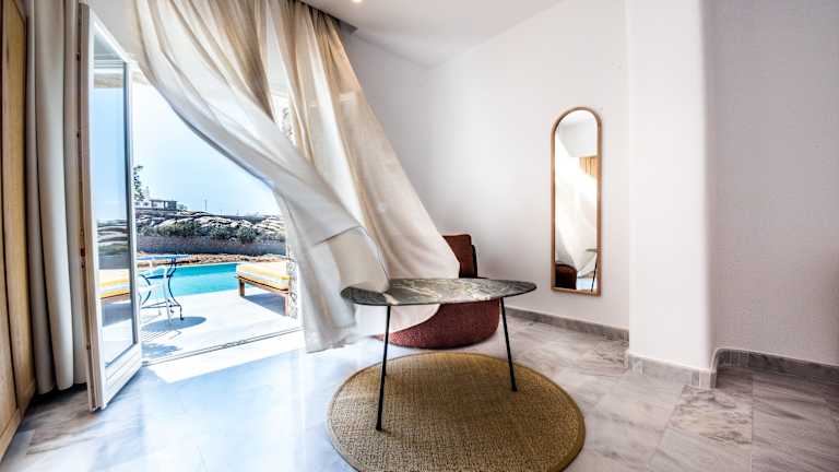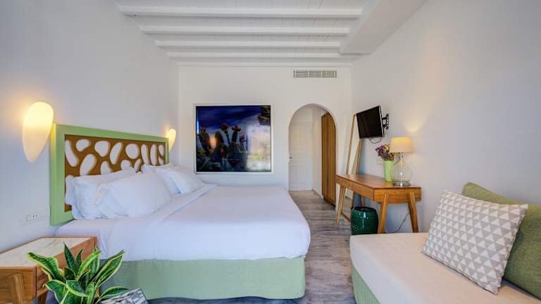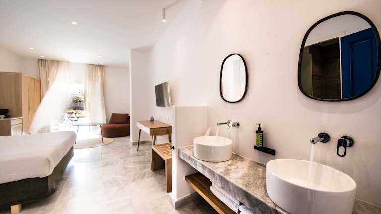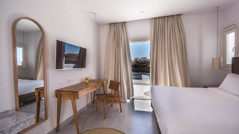 Das Hotel verfügt über 50 Zimmer, die sich sowohl im Haupthaus als auch in den Nebengebäuden befinden. Die Zimmer sind komfortabel eingerichtet und bieten eine Klimaanlage, Heizung, einen Balkon oder eine Terrasse mit Meerblick, ein Doppelbett oder ein Sofabett, einen Safe, eine Minibar, einen Kühlschrank, eine Tee-/Kaffeemaschine, einen Fernseher, einen Haartrockner und kostenfreies WLAN. Nichtraucherzimmer sind ebenfalls verfügbar.